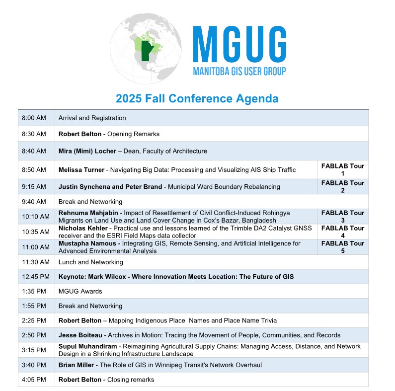 This year’s conference hopes to highlight the wide-ranging and exceptional work of our GIS community, connect individuals and organizations that share an interest in this unique technology, and continue to develop the field of GIS within Manitoba, by way of networking opportunities and student engagement.